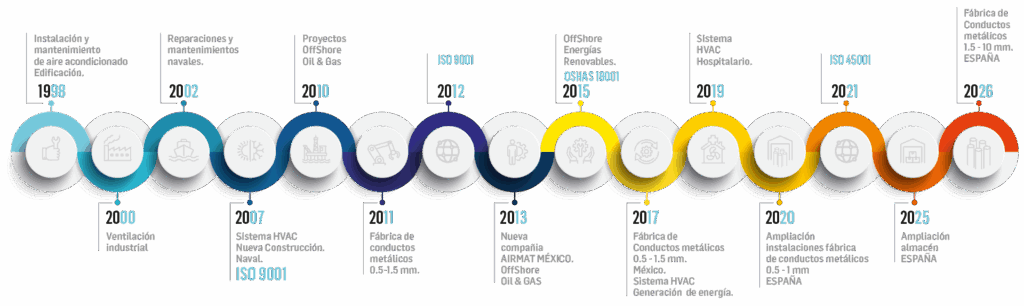 Hoy en día, en Airmat nos especializamos en una amplia gama de servicios que incluyen el montaje, preinstalación, reparación y mantenimiento de equipos de climatización y refrigeración. Nos enorgullecemos de ofrecer soluciones integrales en la instalación y alquiler de sistemas HVAC, tanto en tierra como en entornos marítimos, incluyendo buques y plataformas offshore. Además, diseñamos y fabricamos conductos metálicos en nuestras instalaciones, garantizando la más alta calidad en cada proyecto.